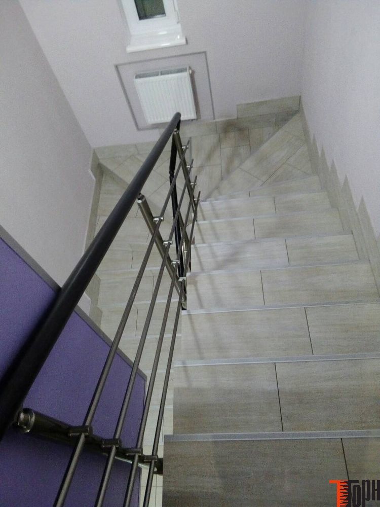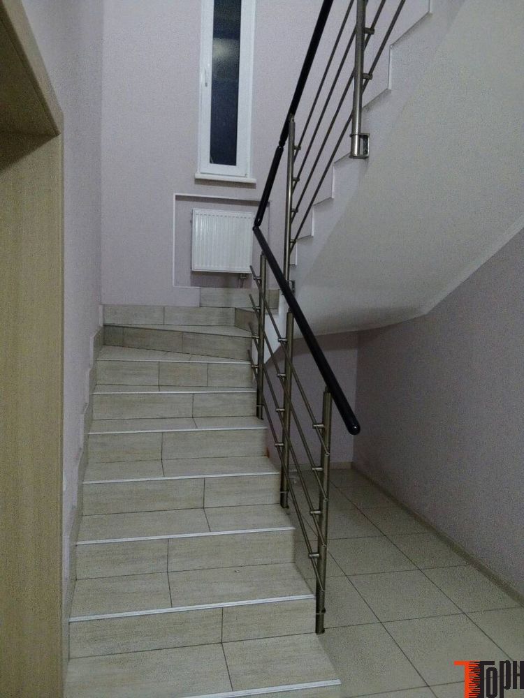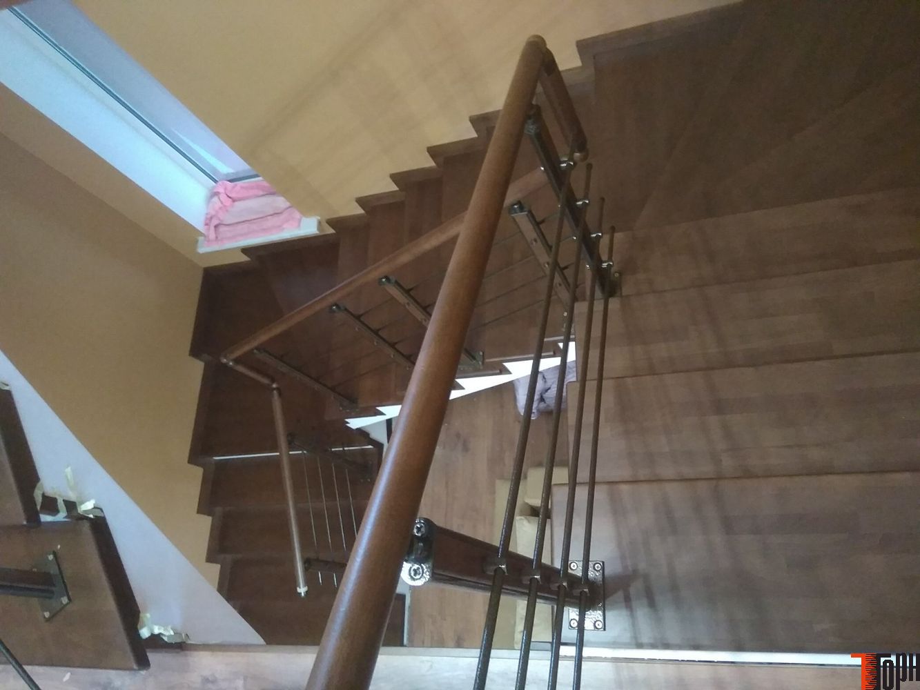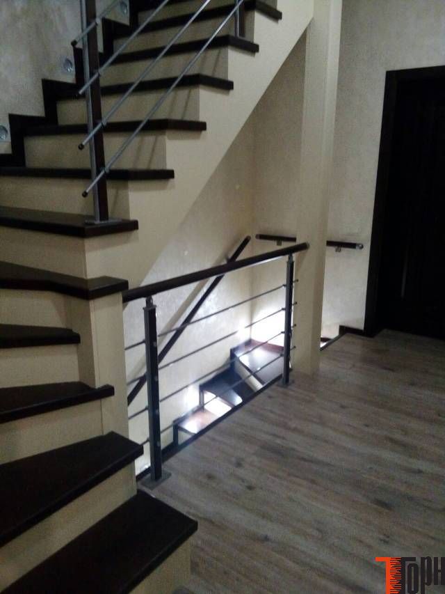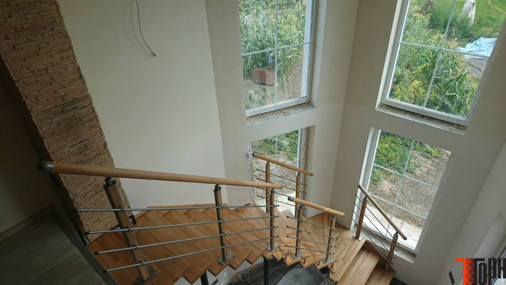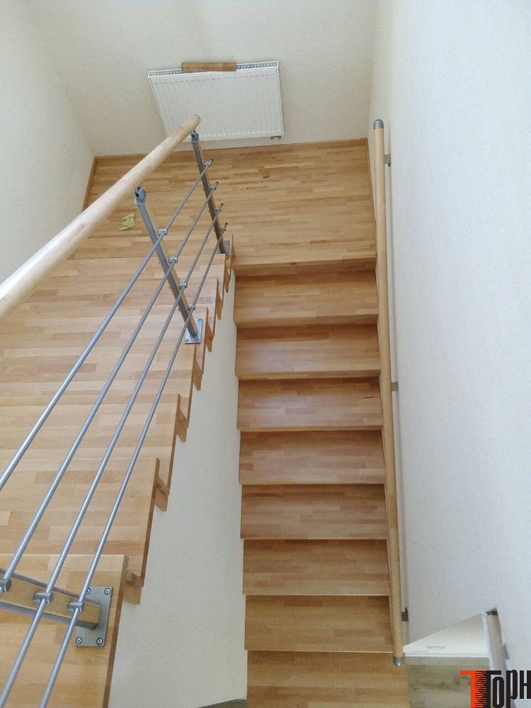 Лестница на 20 подъёмов. Ширина марша (средняя) – 1100 мм. По материалу выбран бук срощенный (в лаке бесцветном). Ограждение выбрано фирменное комбинированное (металл-дерево) в цвете серый металлик. Цена вопроса (по смете всех материалов) – 35000 грн., а как с задачей монтажа справились мастера – видно по фотографиям.
