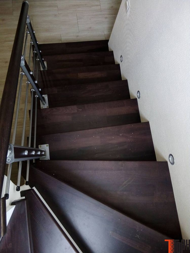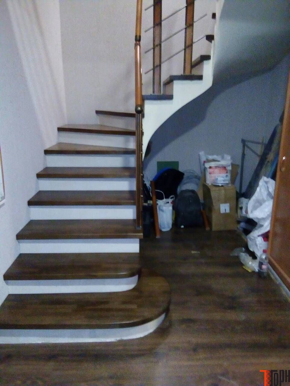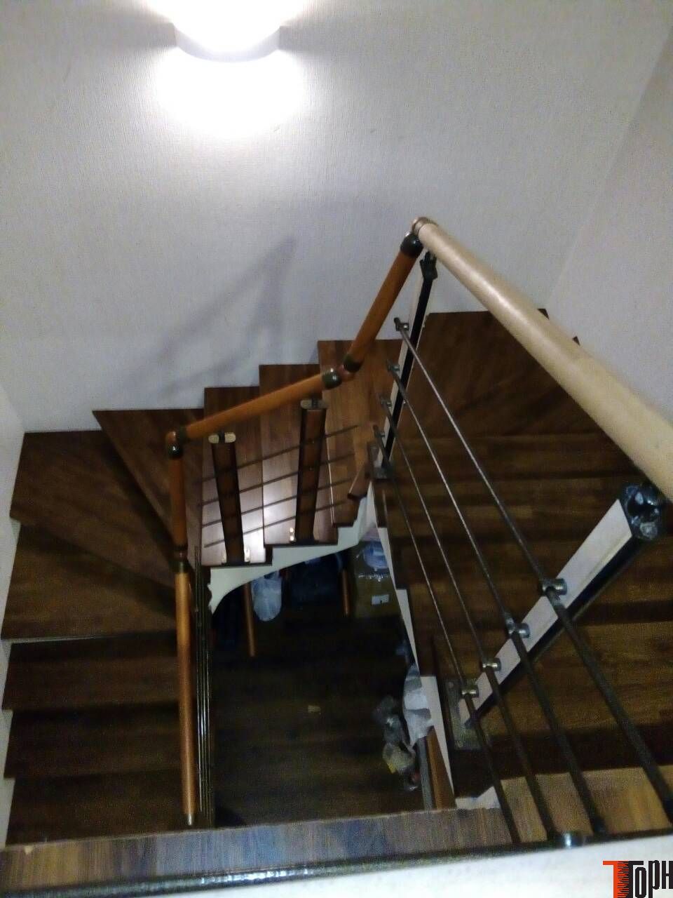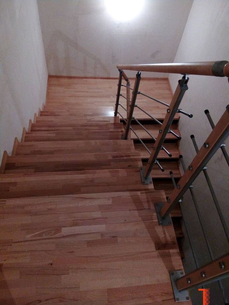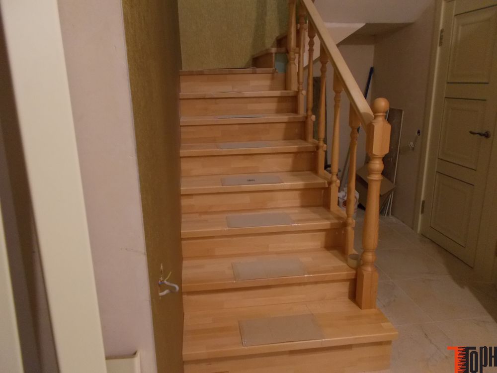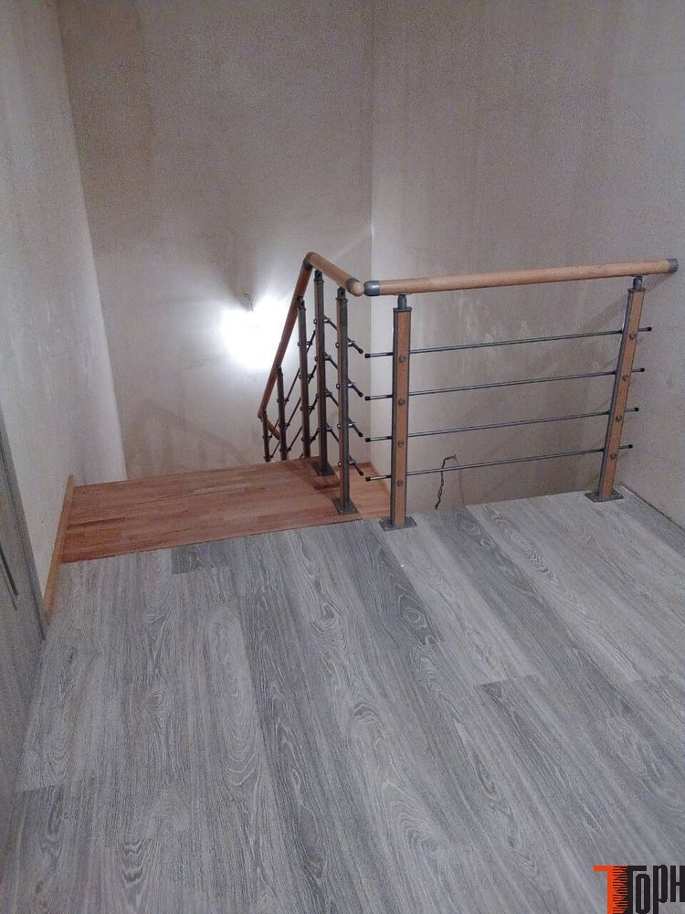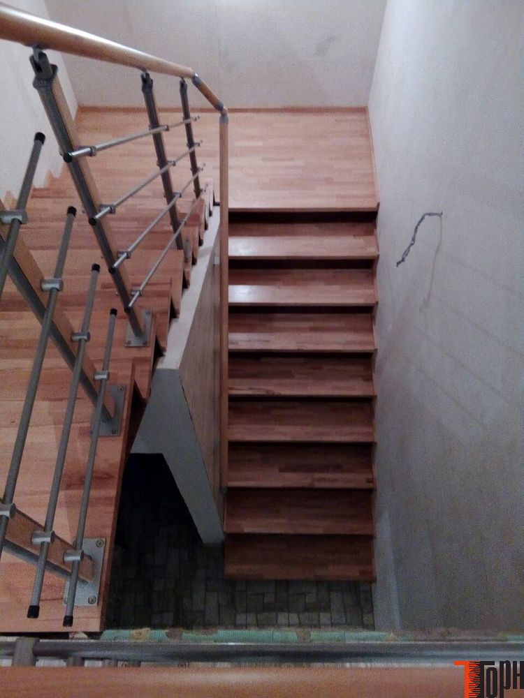 По материалу выбран бук сердцевина (в лаке бесцветном). Ограждение выбрано фирменное комбинированное (металл-дерево). Цена всего вопроса (по смете) – 39984 грн., а как с задачей монтажа справились мастера – видно по фотографиям.