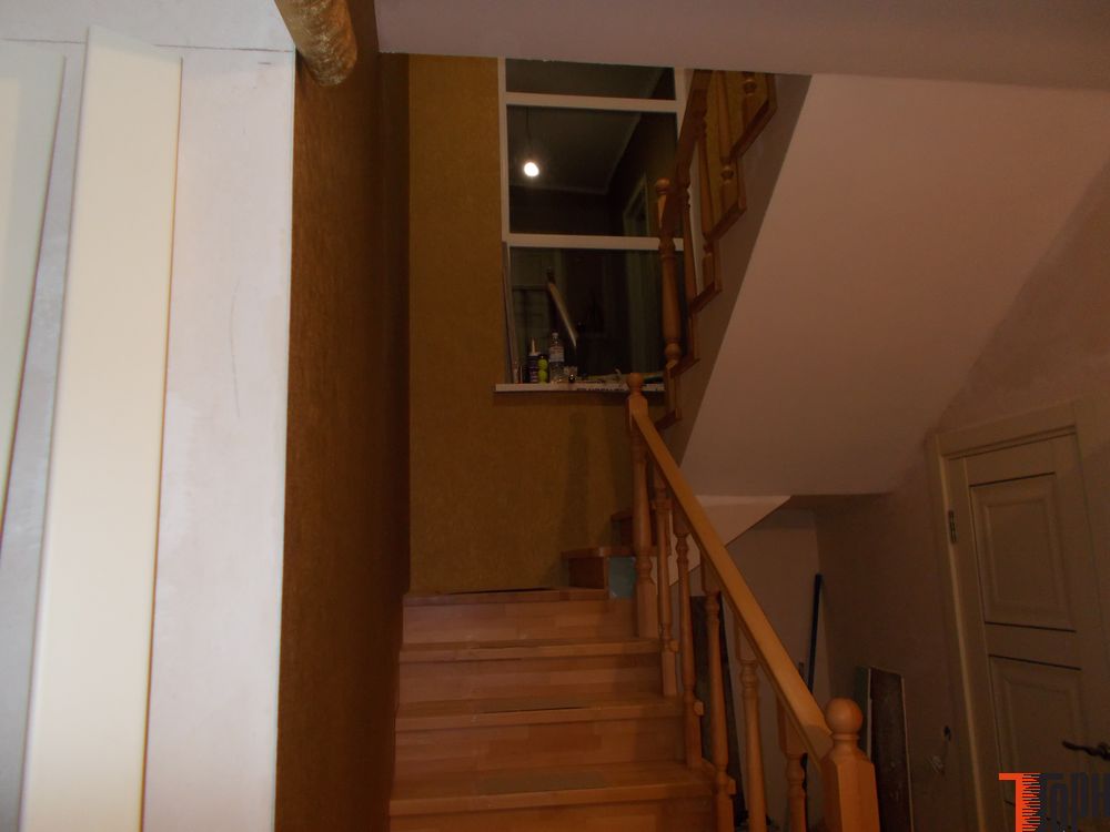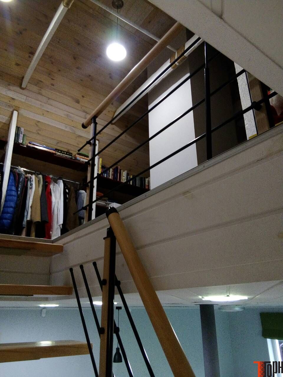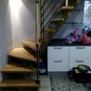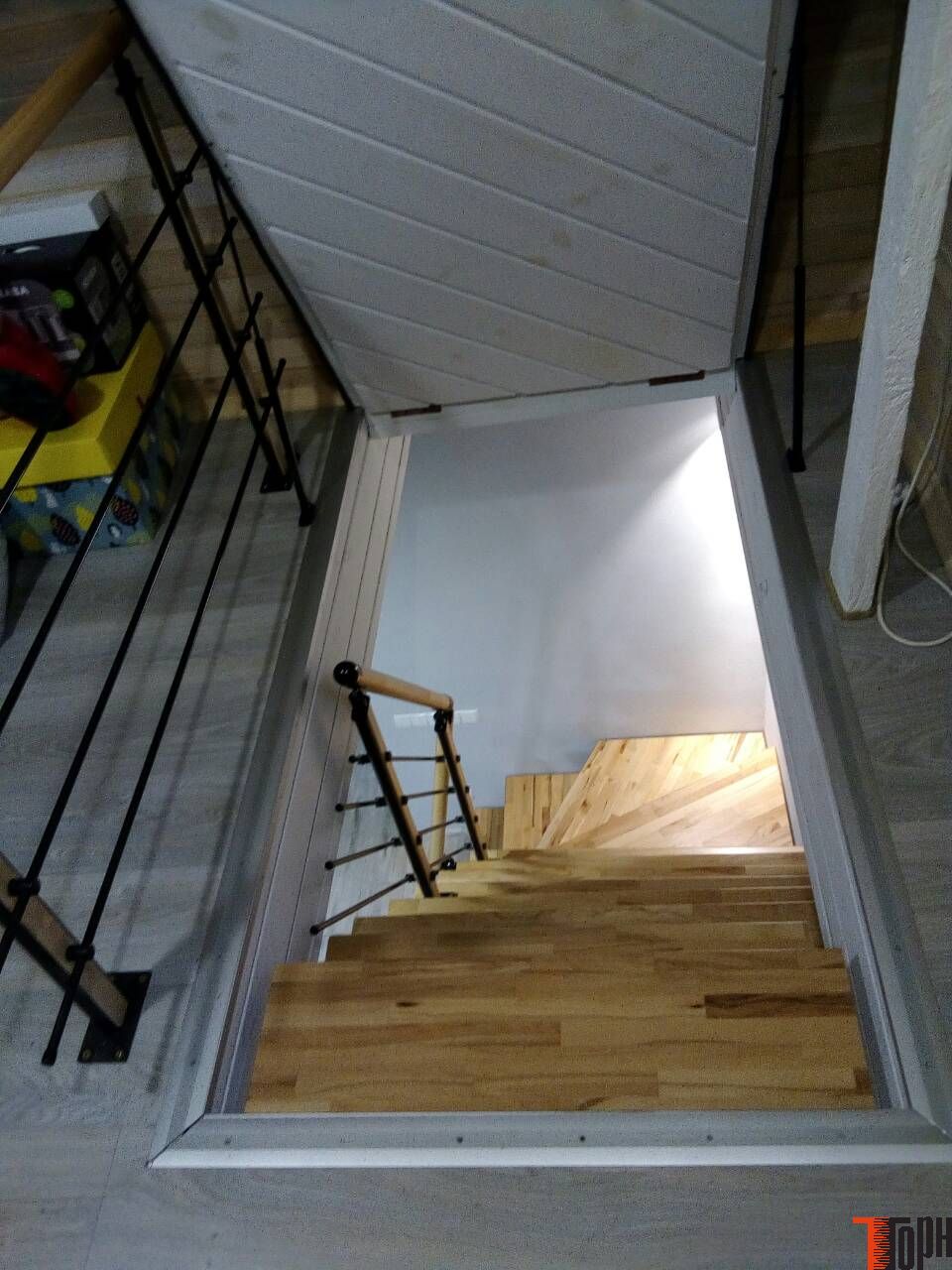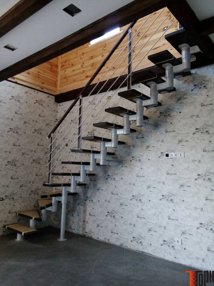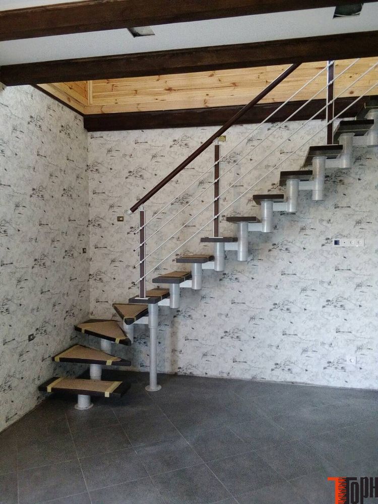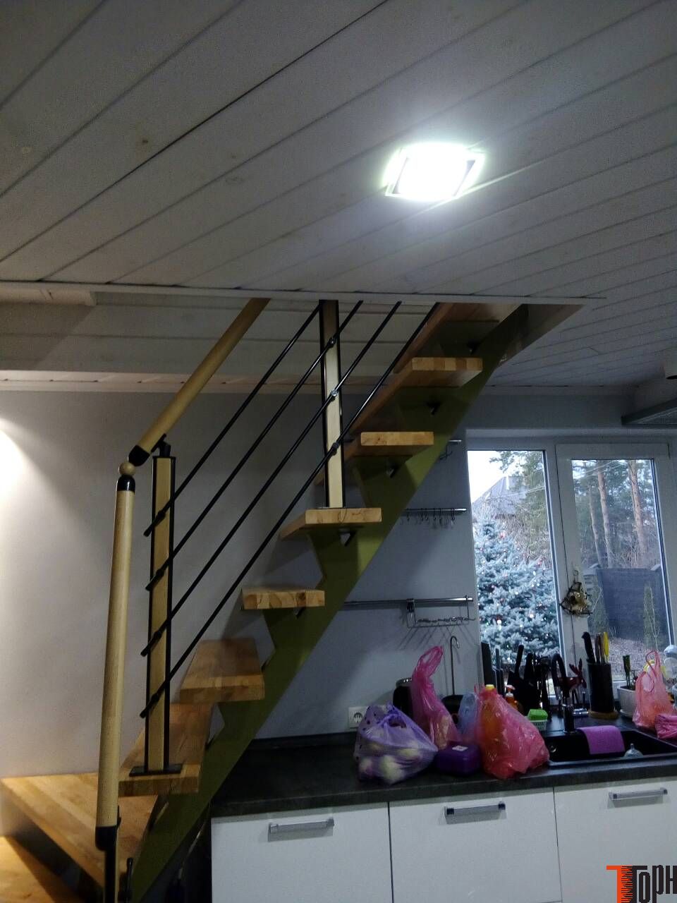 Компактное расположение лестницы на небольшой площади, небольшой проём на втором этаже, бытовая техника и небольшой гардероб под лестницей. При этом недорогая, но функциональная лестница: такая задача стала перед хозяевами дома. И была успешно решена при помощи модульной лестницы.  Более того, при ширине марша 800 мм. отпала необходимость в установлении столба-опоры. Его с успехом заменили две горизонтальных стеновых опоры. Замечу, дом построен из пенополистирола, и лестница даже не крепится уголками к стене. Каркас лестницы обошёлся в 6500 грн. Вот прекрасный пример недорогой, но полностью функциональной лестницы.