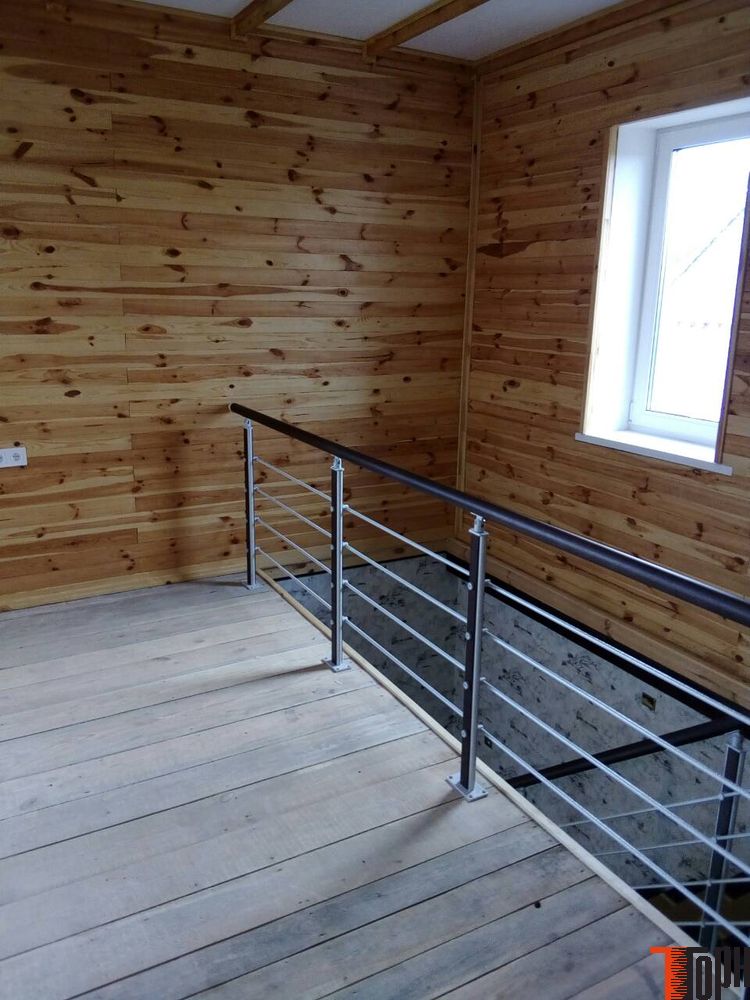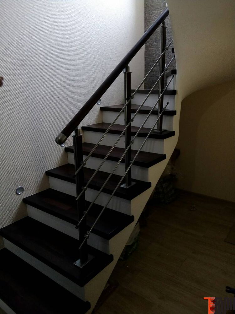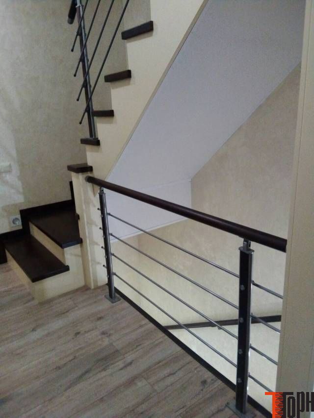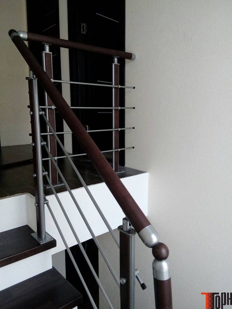 Данный тип ограждения состоит из вертикальных стоек (рекомендуется ставить через одну или две ступени), горизонтальных трубочек (рейлингов), которые устанавливаются в четыре ряда и естественно поручня. Поручень из натурального бука можно тонировать в необходимый цвет. На угол ставится соединение «шар». Рейлинги и поручень закрывается заглушками.