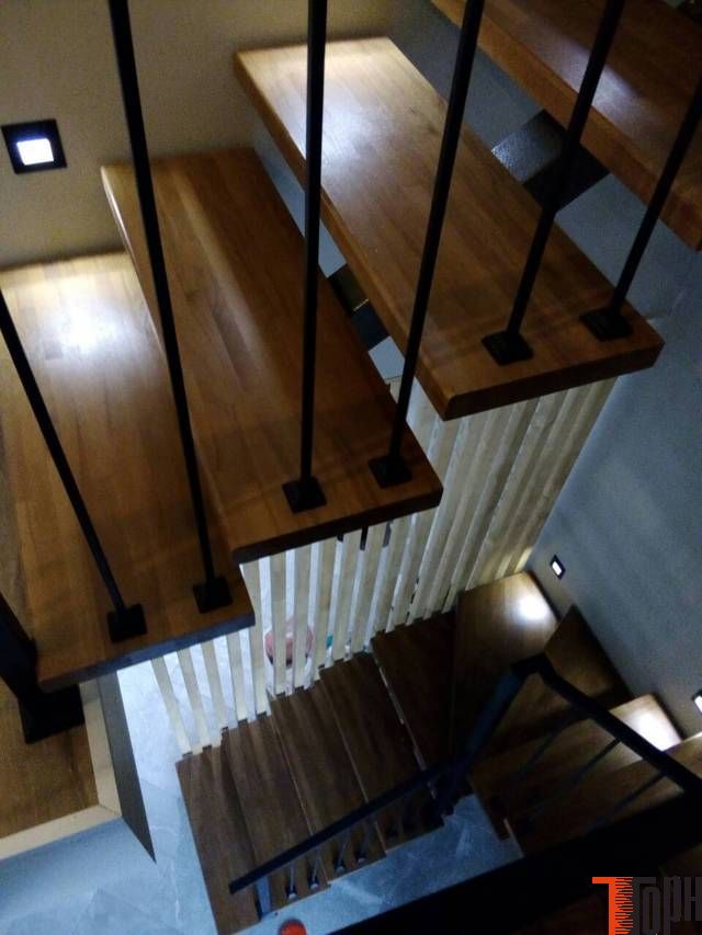 Цвет каркаса – черный графит. Ступени 900х260х40мм, бук цельный (в лаке бесцветном). Т.к. марш лестницы большой, а пристенные доп.опоры закрепить возможности не было, подвесные индивидуальные больца оказались просто необходимы (для избегания возможного шата лестницы, ну и для общего прибавления жесткости конструкции).