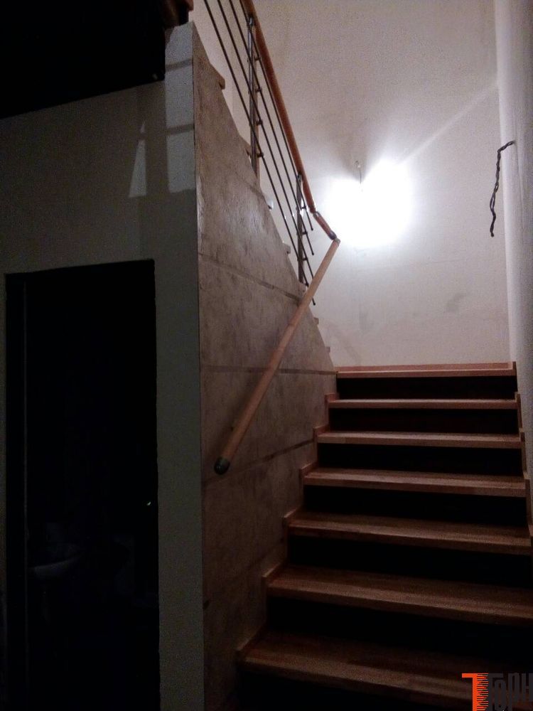 Нужно было зашить готовый каркас деревом (ступени шириной 1200мм, подступени, 2 ступени-площадки) и сделать ограждение (по запросу – красивое, жесткое и современное). По материалу выбран бук срощенный (в лаке бесцветном). Ограждение выбрано комбинированное (металл-дерево). Цена всего вопроса (по смете) – 17189грн. И мастера, по-моему, с задачей справились отлично.