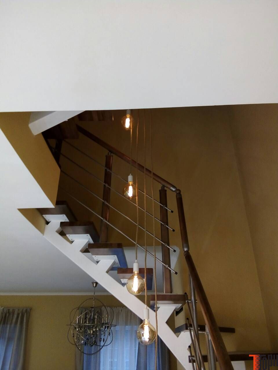 Задача была не из простых, т.к. лестничный проём маловат (1800 х 900 мм), а подняться нужно на высоту 3метра, и желательно комфортно, и желательно не удариться головой об потолок при подъёме. В стандартном случае при просчёте получаем высоту подъёма аж 23 см (при ступени 800х220). Но за счёт нестандартного решения (индивидуальной забежной группы, состоящей из 5поворотных ступеней) получили нормальную высоту подъёма (шаг 20см) и нормальную ширину ступени (900 мм). Материал ступеней – бук сердцевина. Отделка – лак с тонировкой. Цвет металла – серый металлик. А как получилось в итоге, смотрите сами. По-моему, эта «скромная» лестница стала маленьким произведением искусства в доме.