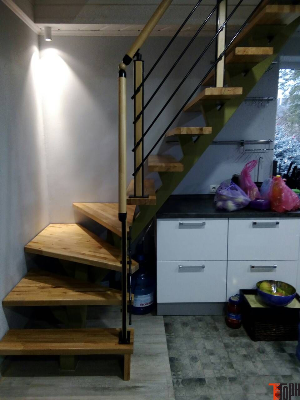 Ограничения пространства 1500 х 1000мм. Подняться нужно на высоту 2850мм. Серия модулей Мини – идеальный помощник в данном случае. Ступенька шириной 600мм и проступью на одну ногу сделали лестницу компактной и относительно удобной. Высота подъёма (шаг) – 22см. По дереву выбран бук сердцевина (в лаке). По металлу – античное золото. Цена вопроса (по смете) – 9150грн.