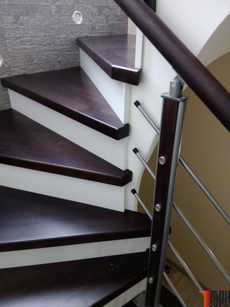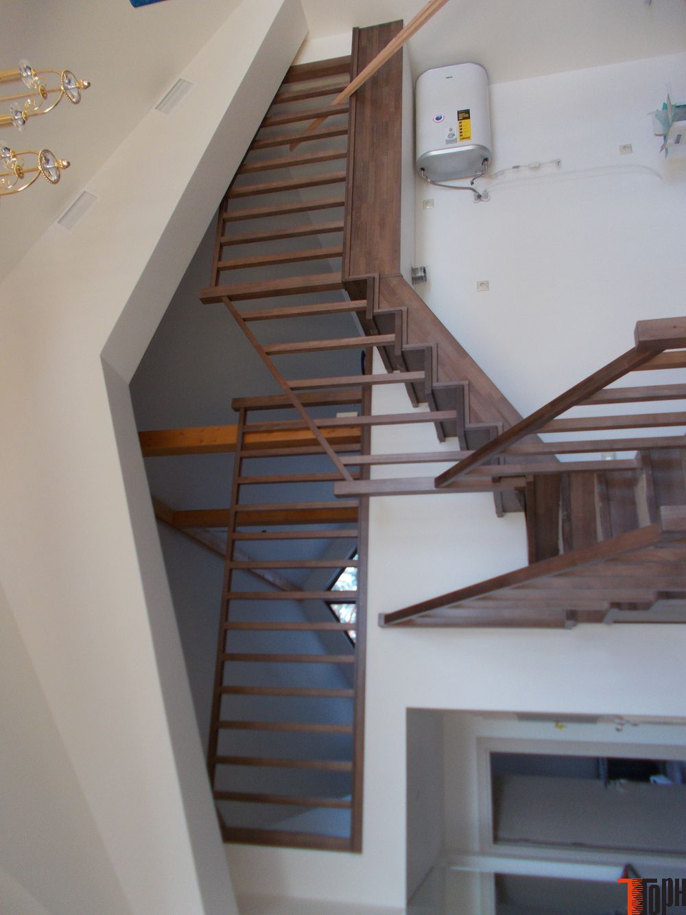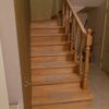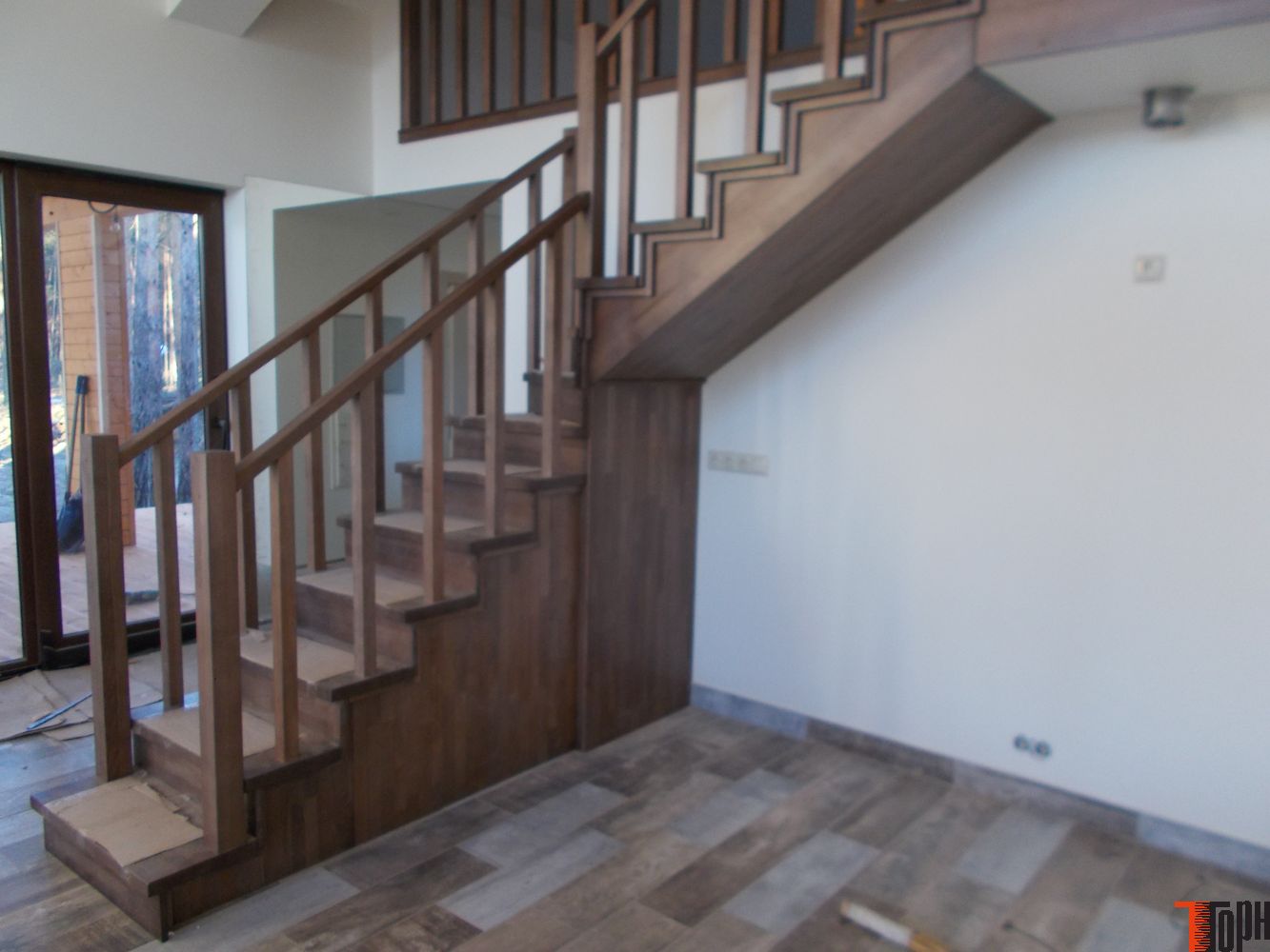 По материалу выбран бук цельный. Отделка комбинированная (ступени, перила и столбы – в лаке с тонировкой, а подступени с балясинами – в лаке бесцветном).