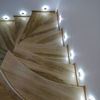 Эта модульная лестница в цвете античное золото со ступенями из сращённого бука – стандартный вариант из 16 модулей. Один поворот, одна забежная группа. Стартовый модуль смонтирован на керамическую плитку. Финишный модуль прикреплён к перекрытию, но не вровень с полом второго этажа, а на одну ступень ниже. Это позволяет сделать ее более комфортной и экономит 1/16 лестницы.